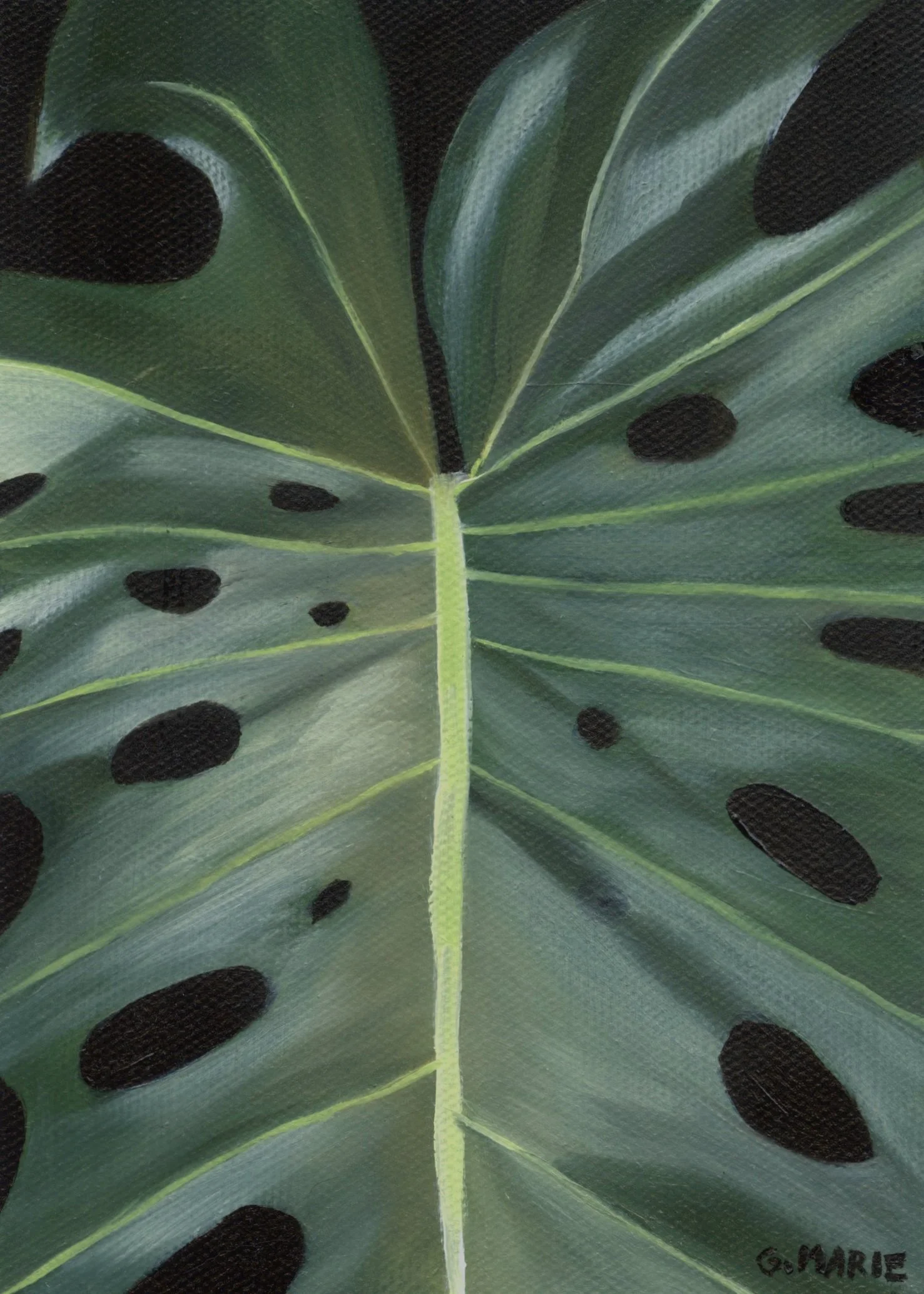 This is the first in a series that started as technical experiments with different painting surfaces. The bold lines and natural patterns of monstera leaves made them ideal subjects for testing how paint behaves on various panels. Plus, we have them in our yard.